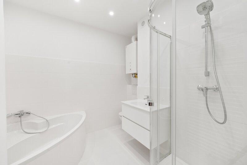 - Bad mit Dusche, Eck-Badewanne, WC, Waschtisch und Handtuchtrockner