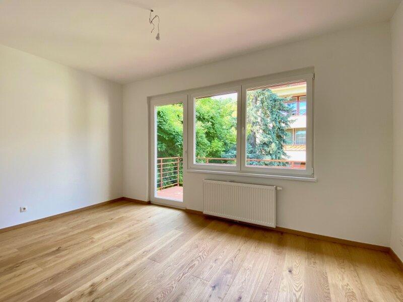 Die frisch sanierte Wohnung in der 2. Etage (ohne Lift) einer gepflegten familiären Wohnanlage mit 2 Häusern und insgesamt nur 12 Wohneinheiten verfügt über knapp 124m² Wohnfläche inklusive einer südseitigen Loggia mit ca. 8m² und zuzüglich eines nordseitigen Balkons mit rund 9m². Vom großzügigen Vorzimmer sind alle Räume zentral begehbar. Der große Wohnsalon wurde mit einer maßangefertigten Tischlerküche ausgestattet, die sich in zeitlos elegantem Weiß präsentiert und mit qualitativ hochwertigen Markengeräten von Bosch versehen. Die Wohnung wurde generalsaniert, neben einem wunderschönen Weitzer-Parkettboden in Eiche wurden moderne dreifach verglaste Fenster mit elektrischen Außenjalousien montiert. Die große Glasfront im einladenden Wohnsalon mit Weitblick gibt einem sofort das Gefühl, mit Familie und Freund:innen Quality Time verbringen zu wollen. Drei Schlafzimmer bieten Platz für alle, wobei man das größte der Zimmer auch noch einmal in der Mitte abteilen könnte. Ein neues Badezimmer in elegantem Weiß mit großformatigen Fliesen sowie eine separate Gäste-Toilette und ein Abstellraum mit Waschmaschinenanschluss komplettieren den Grundriss.