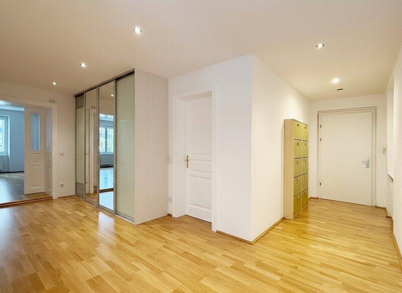 Der Zugang zur Wohnung erfolgt durch einen sehr großzügigen Vorraum mit Tageslicht, in dem viel Platz für Garderobe und Kästen vorhanden ist und auch ein Büro-Eck möglich wäre. Ein Schuhschrank und Garderobenhaken sind bereits vorhanden. Im großen maßgefertigten Einbauschrank mit Spiegelfront ist die Therme versteckt.
