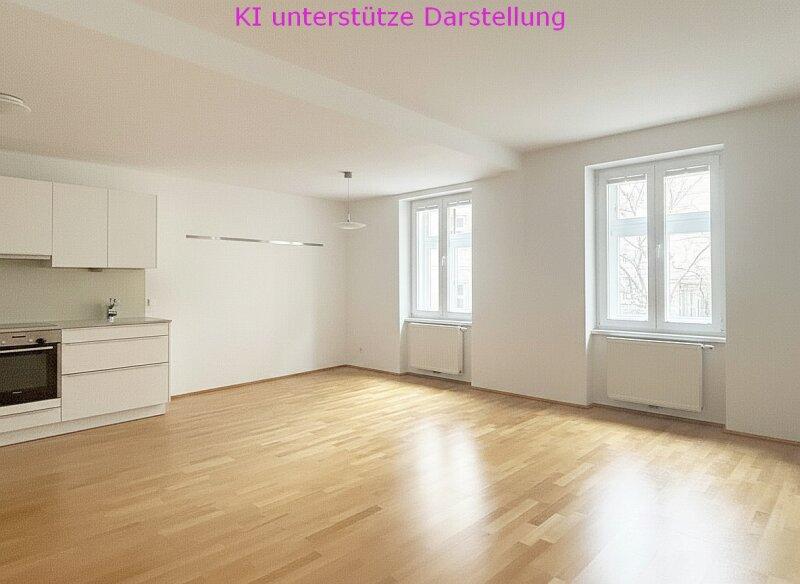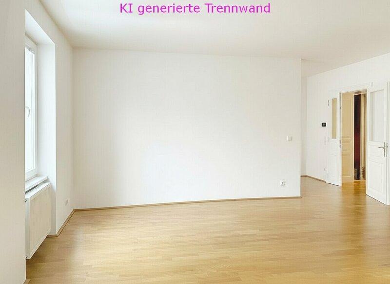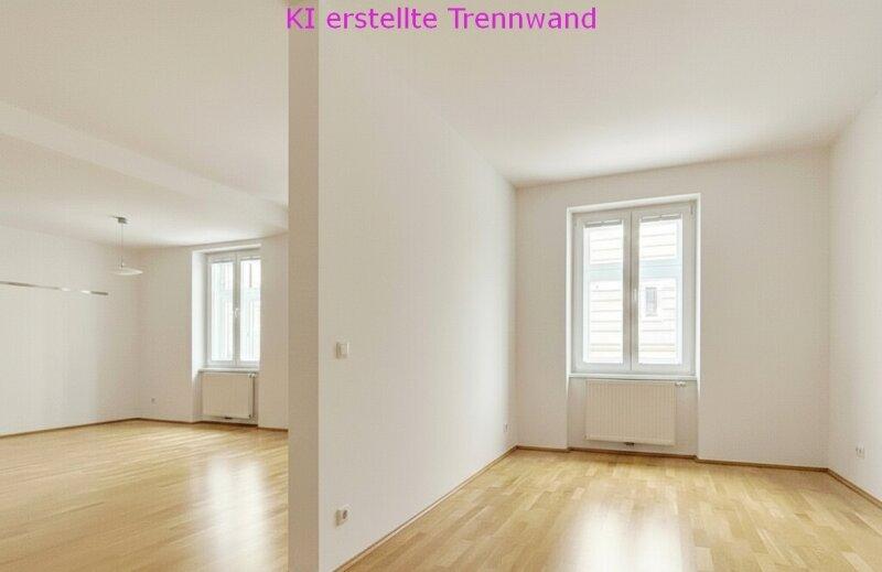 Die Wohnung verfügt derzeit über ein Schlafzimmer - die Abtrennung eines weiteren Zimmers von der großen Wohnküche wäre laut Architektin mit wenig Aufwand möglich, so dass die Wohnung auch als 3-Zimmer Wohnung genutzt werden könnte. Dazu wurden einige Fotos mit einer KI bearbeitet, die dies verdeutlichen sollen.