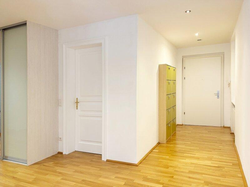 Der Zugang zur Wohnung erfolgt durch einen sehr großzügigen Vorraum mit Tageslicht, in dem viel Platz für Garderobe und Kästen vorhanden ist und auch ein Büro-Eck möglich wäre. Ein Schuhschrank und Garderobenhaken sind bereits vorhanden. Im großen maßgefertigten Einbauschrank mit Spiegelfront ist die Therme versteckt.
