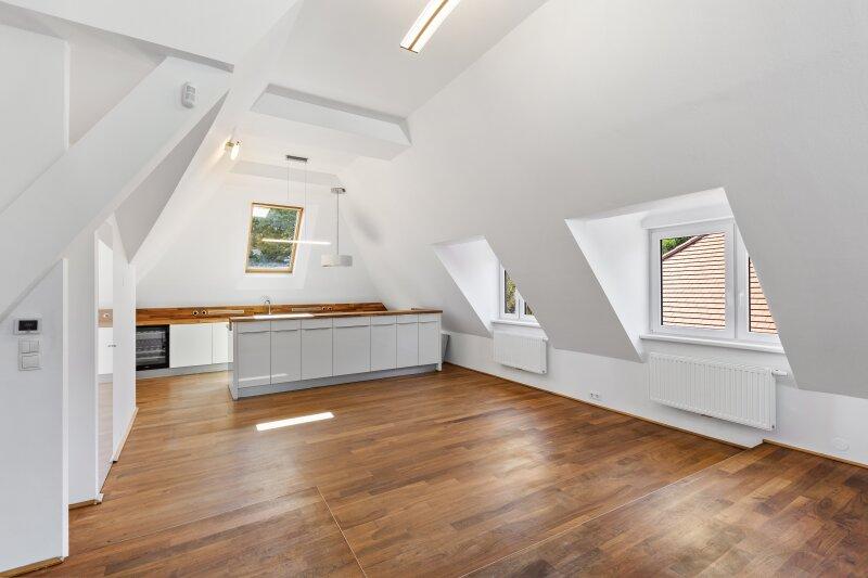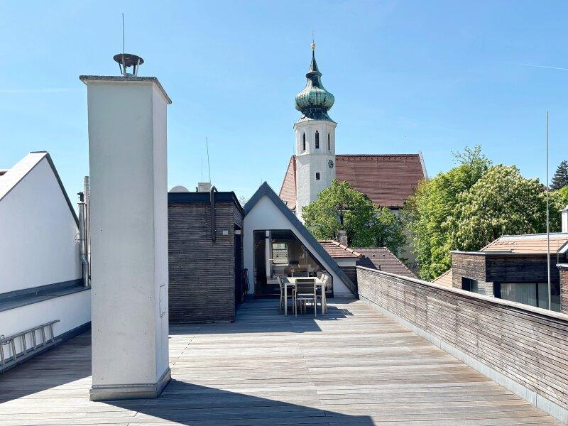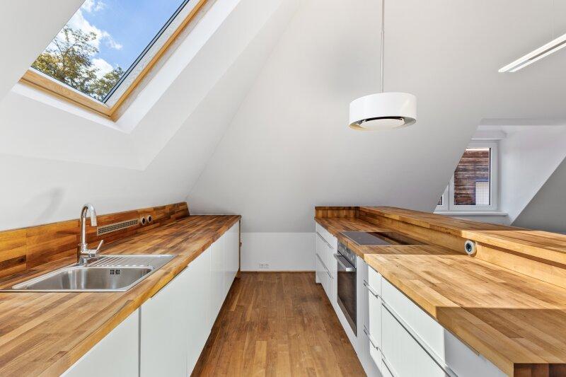 SCHÖNER KOCHEN GEHT NICHT: Durch das Dachfenster im Küchenbereich blickt man direkt auf den Kirchturm. Auf der anderen Seite blickt man auf die Terrasse bzw ins Grüne.