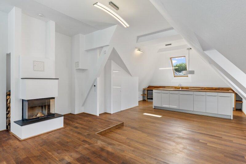 Schon auf den letzten Stufen erkennt man die außergewöhnliche Deckenhöhe und den beeindruckenden Schnitt des Wohn-Ess-Bereichs. An der höchsten Stelle sind es ca. 3,25m Höhe, so dass auch die zum Innenhof gelegenen Dachschrägen kaum mehr ins Gewicht fallen, sondern dem Raum vielmehr eine gemütliche Atmosphäre verleihen. Der an drei Seiten offene Kamin unterstreicht die besondere Atmosphäre des Raums.