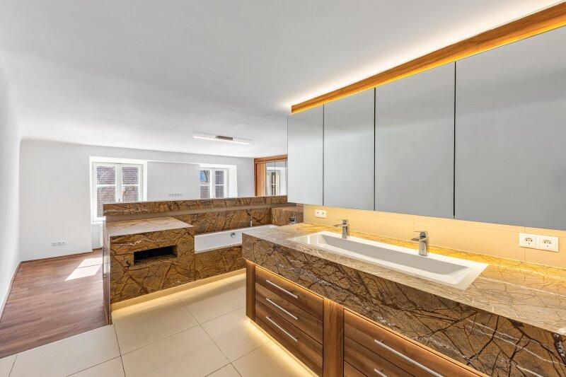 In der Primary-Suite ist das Bad mit hochwertigem Sanitär (Badewanne, Dusche mit Regenduschkopf, Doppelwaschbecken, Handtuchheizkörper) und außergewöhnlichem Marmor sowie indirekter Beleuchtung ausgestattet. Auch der Waschmaschinen-Anschluss befindet sich hier, ist allerdings clever versteckt. Im Schlafbereich bietet ein Einbaukasten viel Stauraum.