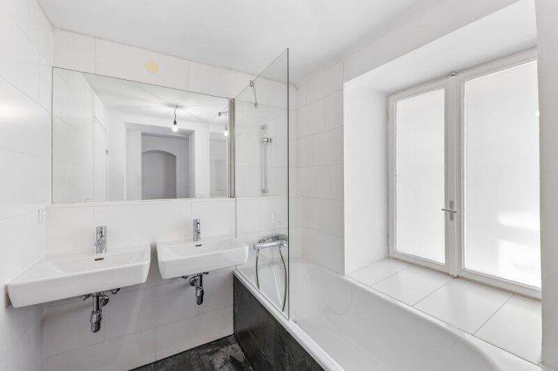 Im zweiten Schlafzimmer ist die Ausstattung schlichter, aber trotzdem hochwertig und bietet im Tageslicht-En-Suite Bad ebenfalls ein Doppelwaschbecken und eine Badewanne sowie ein nochmals separat angelegtes WC.