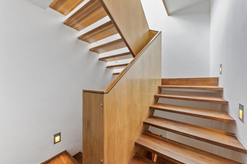 Über eine schöne Holzstiege gelangt man in die "WOHN-ETAGE", in dem zwei Schlafzimmer mit jeweils eigenen Bädern und separaten WCs untergebracht sind.