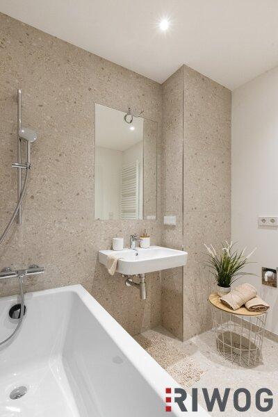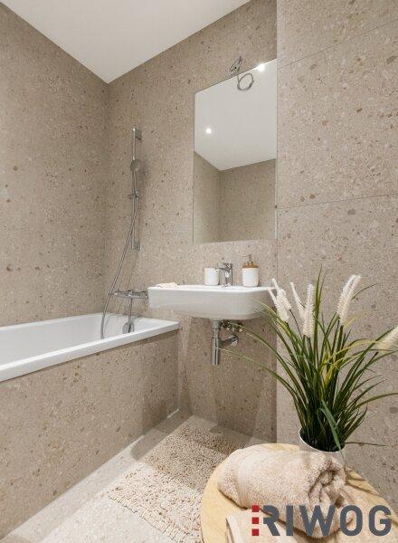 Bei den gezeigten Bildern handelt es sich einerseits um Visualisierungen, andererseits um Fotos der Musterwohnung (Bauteil Ottakringer Straße, Top 1/6) mit gleicher Ausstattung.