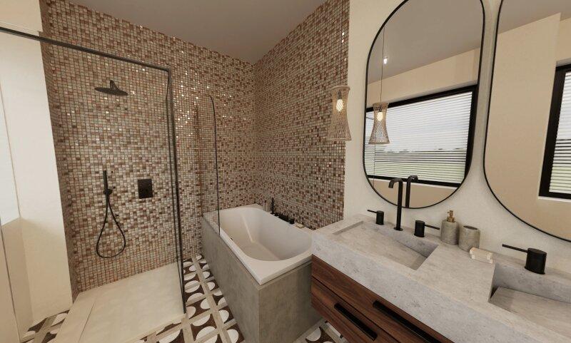 • Badezimmer mit Walk-in-Dusche, Feinsteinzeug, Waschtisch & Waschmaschinenanschluss