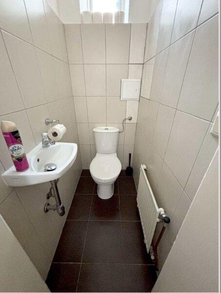 Zuletzt gelangt man in das Badezimmer mit Wanne, Handwaschbecken, WC und sehr gut erhaltener Waschmaschine.