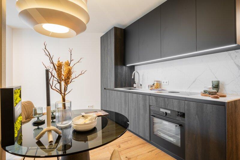 Die Wohnung wird mit einer modernen Küche ausgestattet und verfügt zudem über ein modernes Bad mit Dusche. Eine Vollmöblierung ist gegen gesonderte Vereinbarung ebenfalls denkbar. Fußbodenheizung, Kühlung in Form von Fan Coils und eine kontrollierte Wohnraumlüftung garantieren höchsten Wohnkomfort.